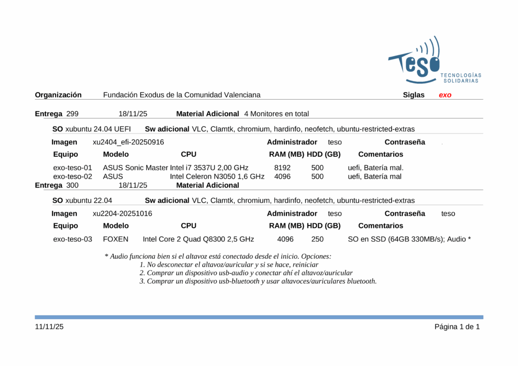 Se han entregado 2 portátiles, un equipo formato Torre y 4 monitores a la asociación “Fundación Exodus de la Comunidad Valenciana”.